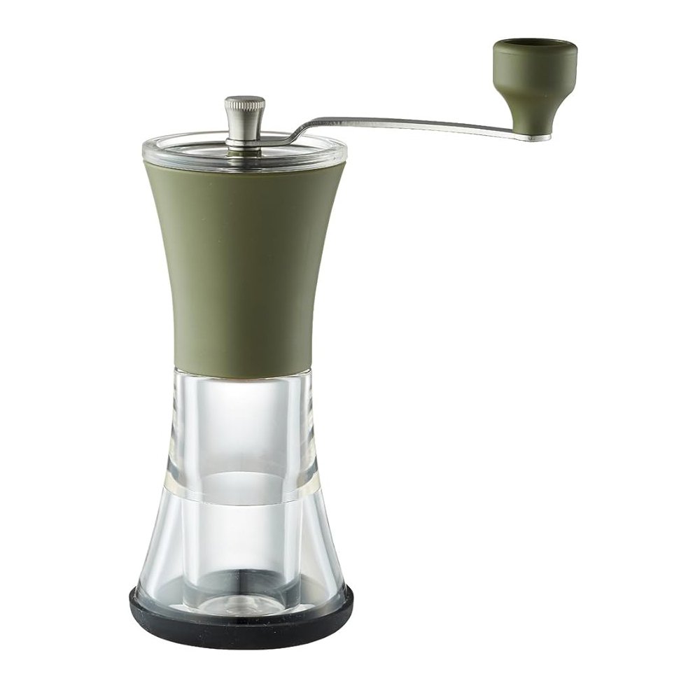Moedor manual Kalita modelo KKC 25, Base de silicone antiderrapante, Lâmina de cerâmica. Possui ajuste de espessura do grão. Gire o botão de ajuste para a direita (sentido horário) para moagem fina. Gire para a esquerda (anti-horário) para moagem mais grossa.