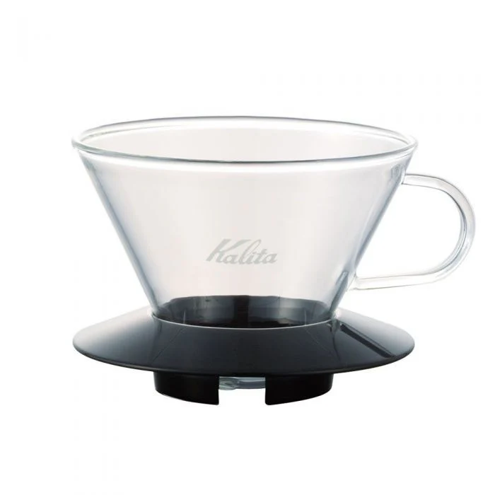 Dripper modelo 185 marca Kalita, com base reta, feito em vidro, base preta.